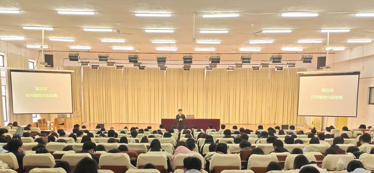 在会议过程中,首先由宿管部负责老师进行开场发言,详细阐述了宿舍中频发的若干问题,主要包括违规电器使用、用电安全事项以及宿舍卫生状况。随后,主持人宣读了文明宿舍获奖名单。接着,辅导员为获奖宿舍的代表颁发了荣誉证书及奖品。此外,会议尾声特别邀请了优秀宿舍的舍长代表上台,分享了他们在宿舍管理方面的宝贵心得与经验。