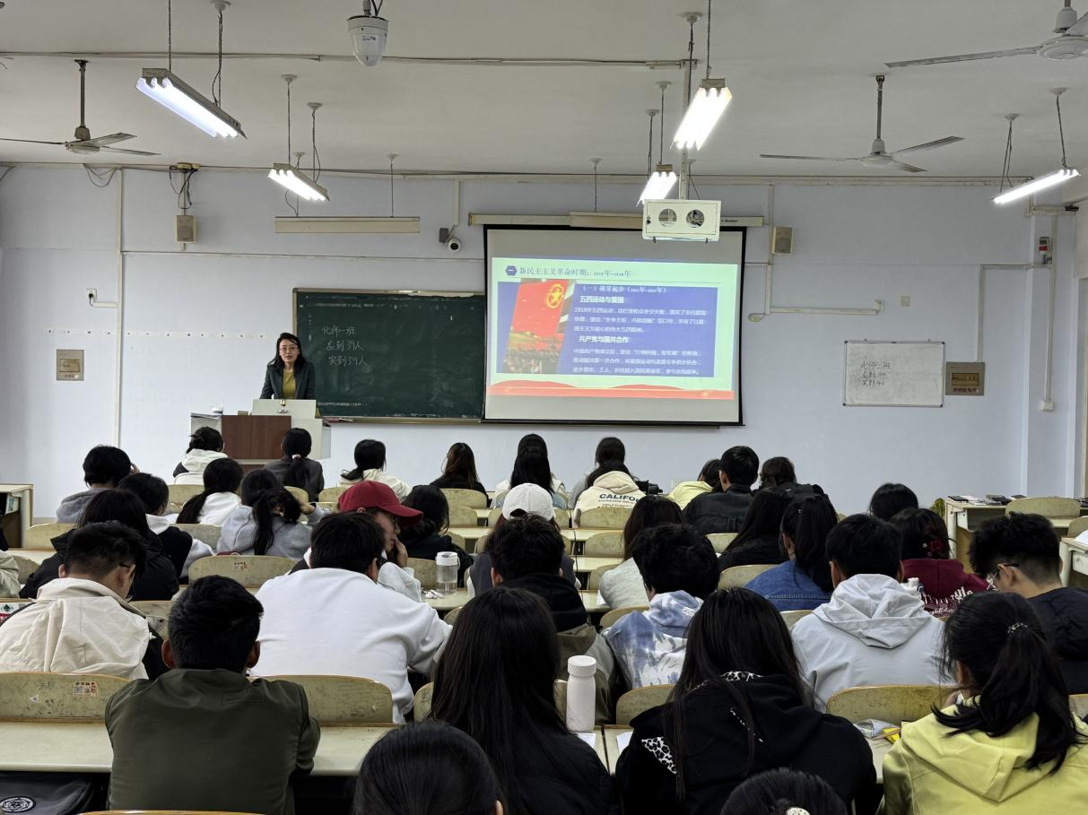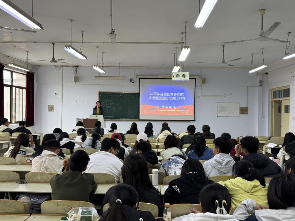 为厚植青年学子爱国情怀,强化国防意识,引导学生从百年征程中感悟时代责任,自觉将个人理想融入强国强军伟大实践,10月17日上午,化学化工学院党委书记于求实楼407教室讲授“从百年征程到青春启航 共话爱国国防与时代担当”专题思政课,2025级化学师范一班、二班全体学生参加。