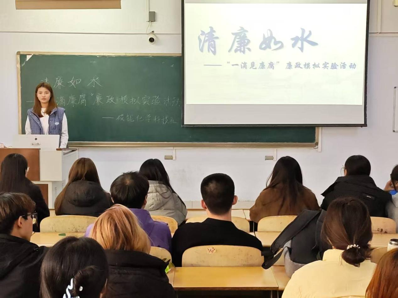 为增强学生的廉洁意识,创新廉政教育形式,11月11日,化学化工学院于求实楼207教室举办“‘一滴见廉腐’廉政模拟实验”活动。活动共60余人参加。