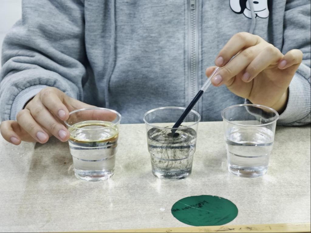 活动中,主持人将“分子极性”“相似相溶”等化学原理,设计墨水滴入清水等可视化实验,将廉洁理念具象化为可观察的科学现象。同学们通过观察墨水滴入清水及油水分层等现象,生动诠释“廉洁与清廉环境相融、腐败与廉洁环境相悖”的深刻道理。