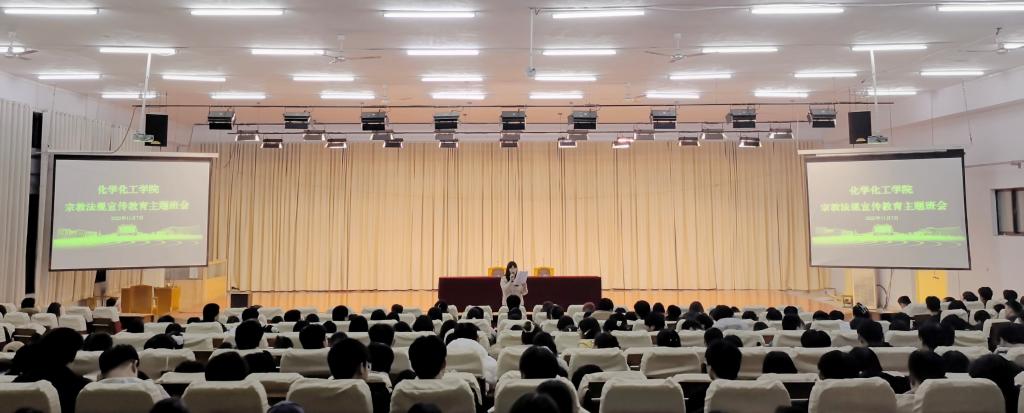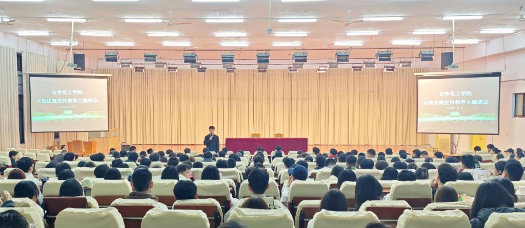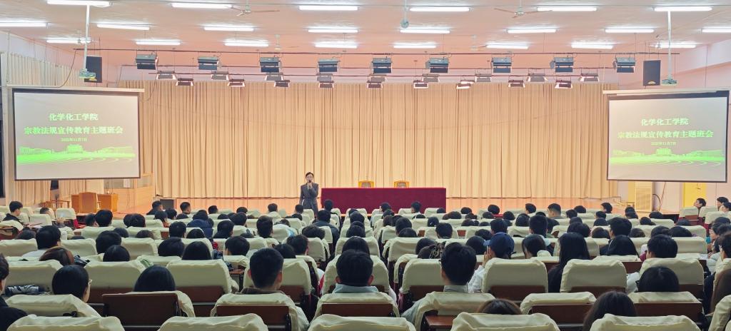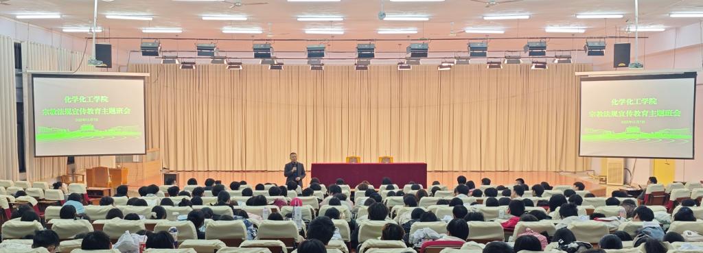 为深入贯彻落实国家宗教工作方针政策和法律法规,切实加强大学生思想政治引领,筑牢校园意识形态安全坚固防线,化学化工学院于11月7日在求实楼409教室举办宗教法规安全教育专题讲座。学院党委书记主讲,全体学生参加。