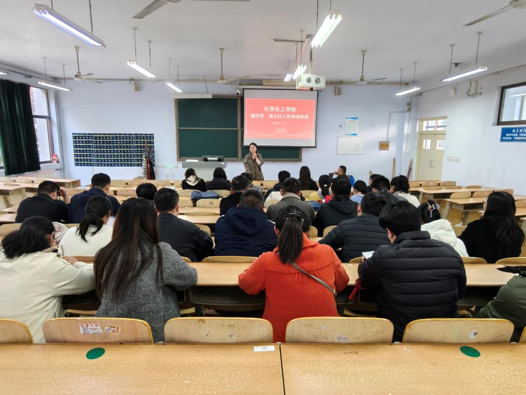 为进一步加强学生工作队伍建设,提升辅导员、班主任的政治素养、理论水平和业务能力,特别是增强其对校园非法宗教活动的辨识与防范能力,切实维护校园和谐稳定,11月11日,化学化工学院在求实楼117教室组织召开了全体辅导员、班主任工作培训会议。学院党委书记、副书记、学生工作办公室全体成员以及各班级班主任参加了本次会议。